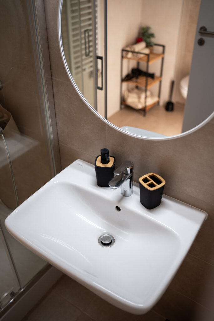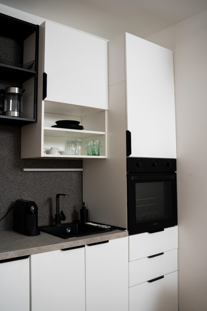 Our modern kitchenette comes with everything you need — stove, oven, fridge, coffee machine, dishes, and utensils — ideal for short or long stays.